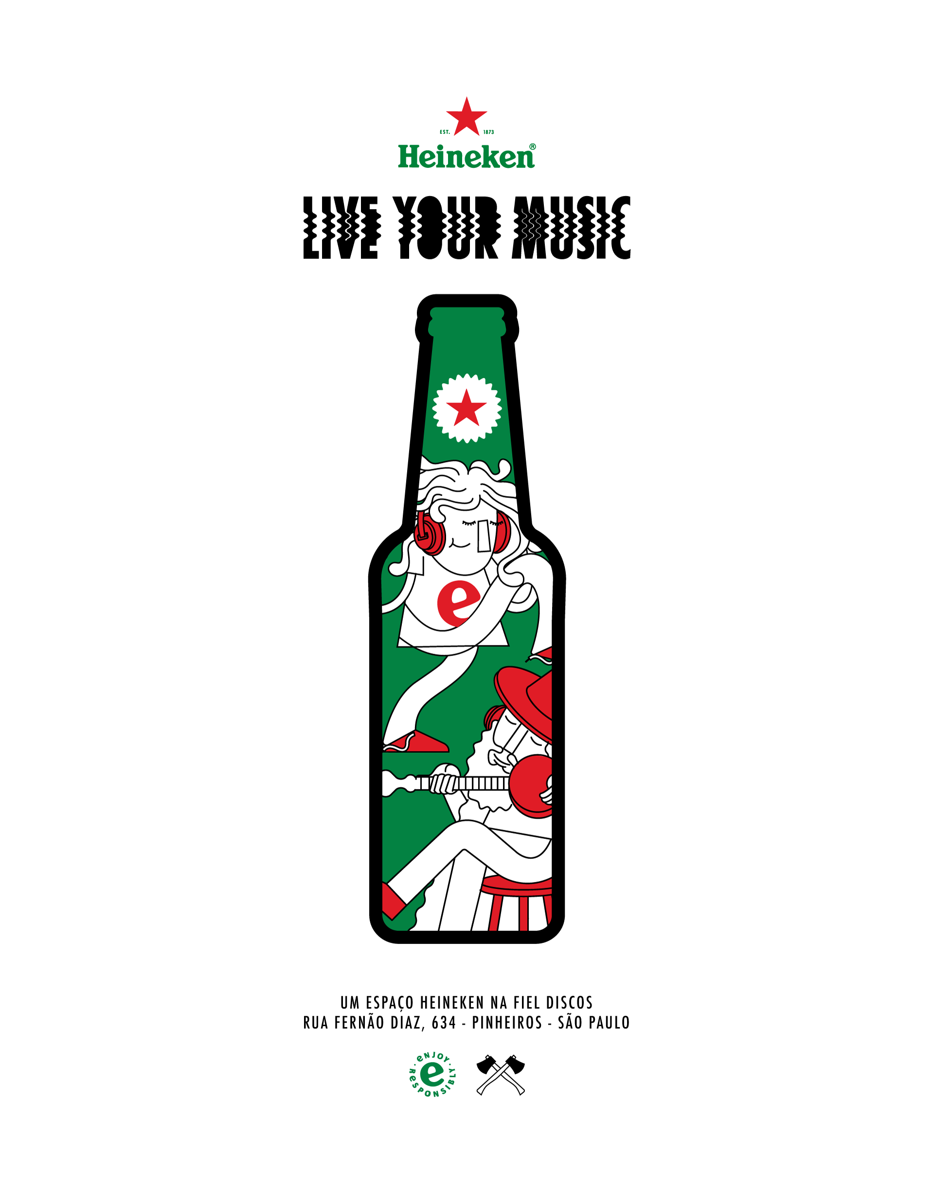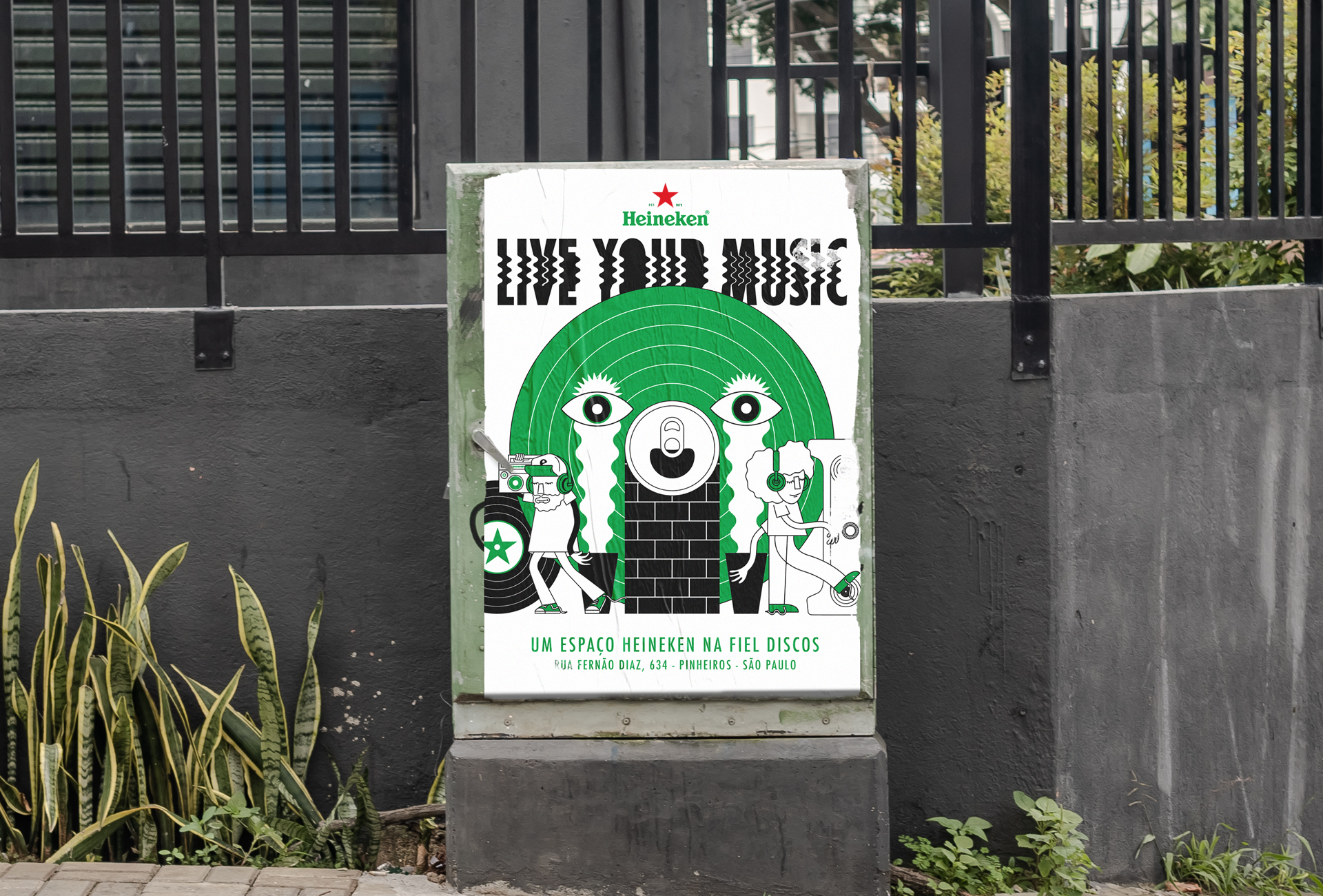 Um espaço dentro da Fiel Discos, em São Paulo, assinado pela plataforma musical da Heineken [Live Your Music]. Com uma vitrola, fones de ouvido e uma seleção de discos escolhidos a dedo, qualquer pessoa pode viajar e viver a música como preferir. A ilustração proporciona um mundo utópico regido pela música e foi replicada em aplicações gráficas dentro do próprio espaço e em materiais efêmeros, gráficos e digitais.